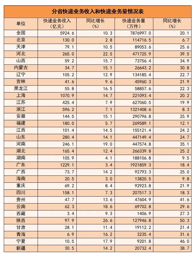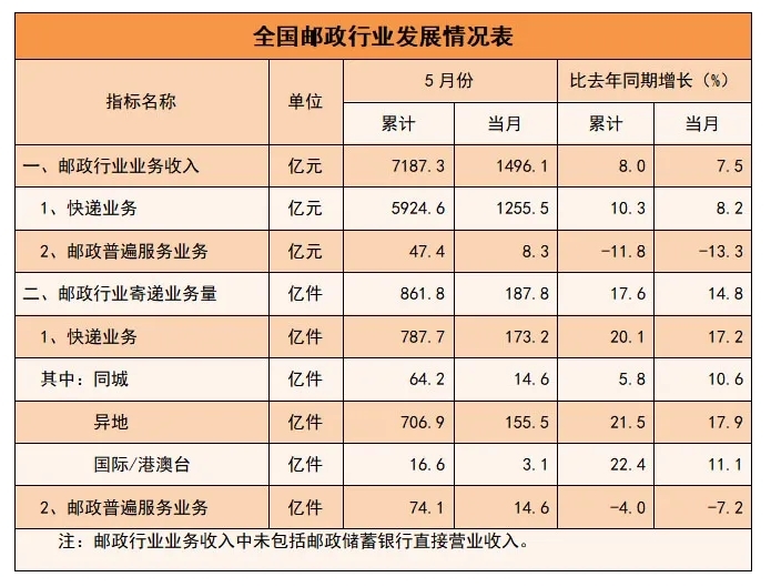 1-5月,邮政行业业务收入累计完成7187.3亿元,同比增长8.0%。其中,快递业务收入累计完成5924.6亿元,同比增长10.3%。