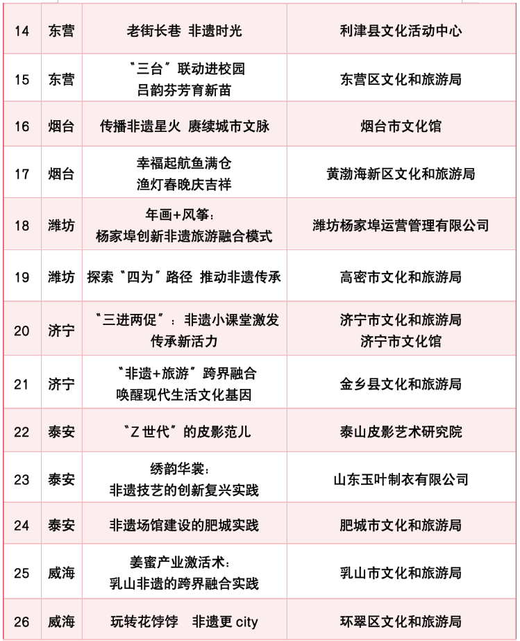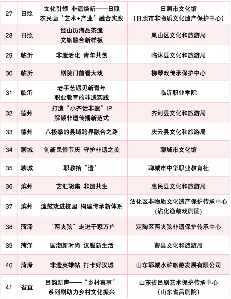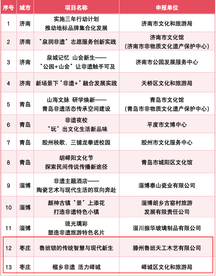 6月14日,记者从文旅山东微信公众号了解到,为进一步推动非物质文化遗产的创造性转化、创新性发展,更好融入现代生活,山东省文化和旅游厅组织开展了“非遗融入现代生活”创新实践项目推荐工作。经项目申报、专家推荐等程序,确定了43个山东省“非遗融入现代生活”创新实践项目,其中枣庄市两个项目上榜。