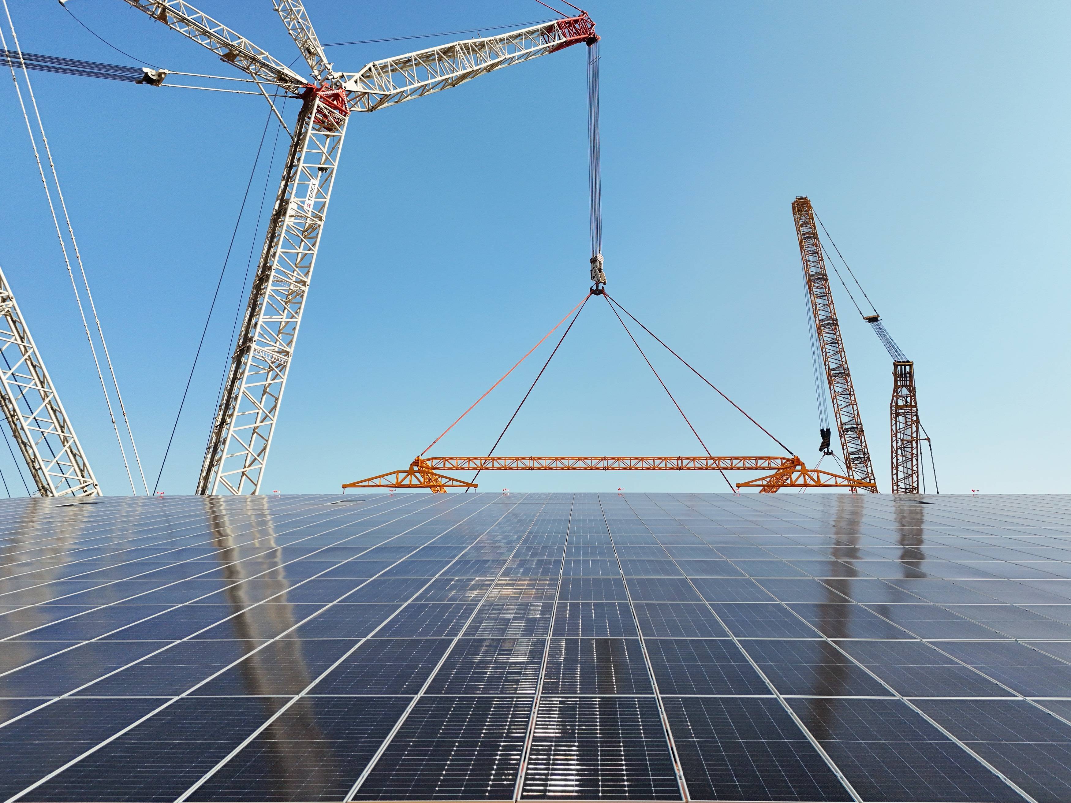 6月16日,多座大型钢桁架海上光伏平台在山东港口烟台港莱州港区进行装配作业,完工后将被运往全球首个吉瓦级海上光伏项目——国家能源集团国华HG14海上1GW光伏项目建设现场。(YMG全媒体记者 唐克 摄)