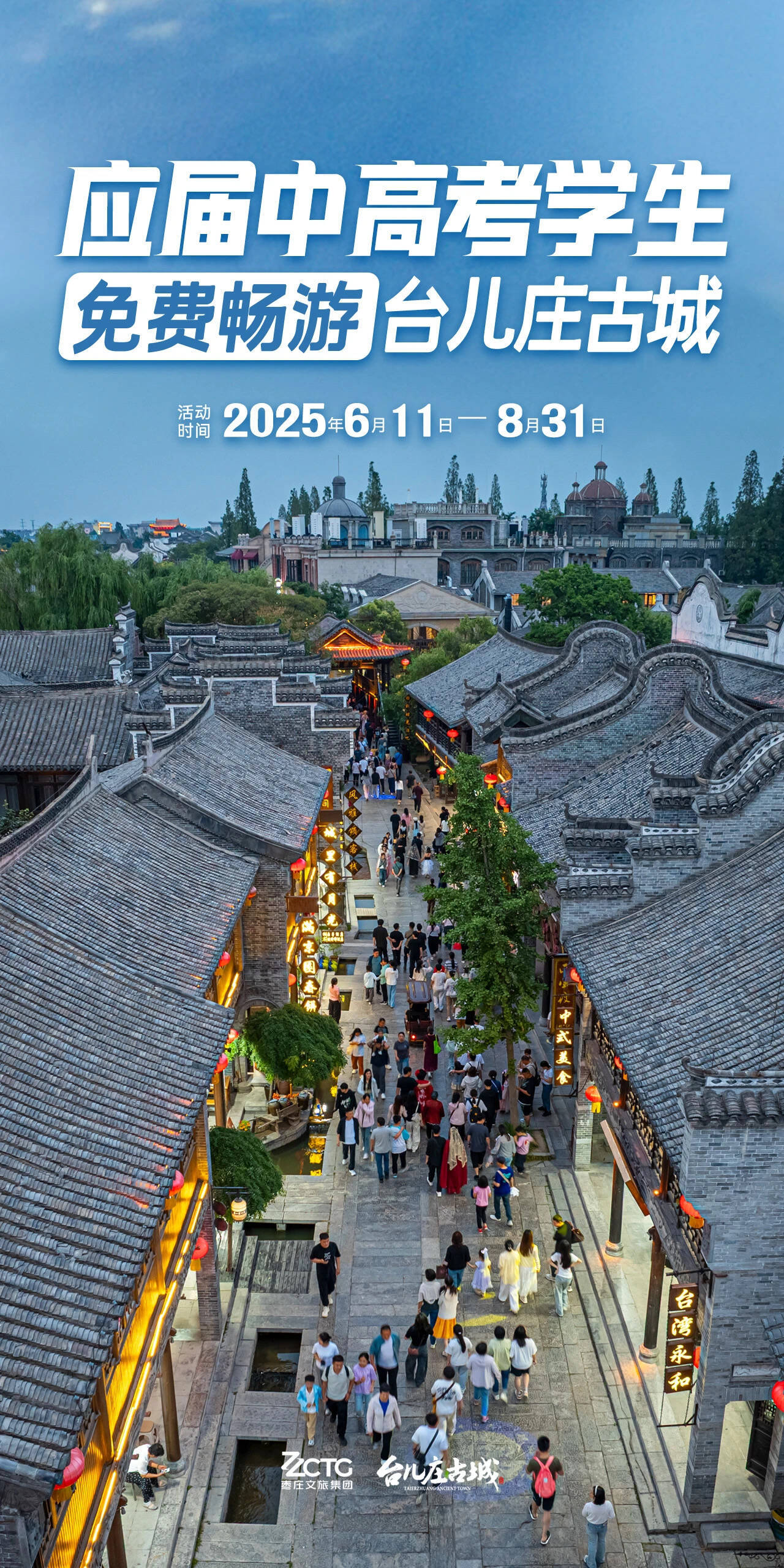 台儿庄古城景区面向全国中高考学生实行门票免费政策,免费人群:2025年全国应届中高考学生(包含普通中高考学生、春季高考学生)。免票时间:2025年6月11日—2025年8月31日。活动景区:台儿庄古城景区、台儿庄运河湿地公园、台儿庄双龙湖观鸟园。入园流程:各景区实行实名制预约,请在购票渠道预约“2025年中高考生免费票”,预约成功后,凭本人准考证原件和身份证原件检票入园。
