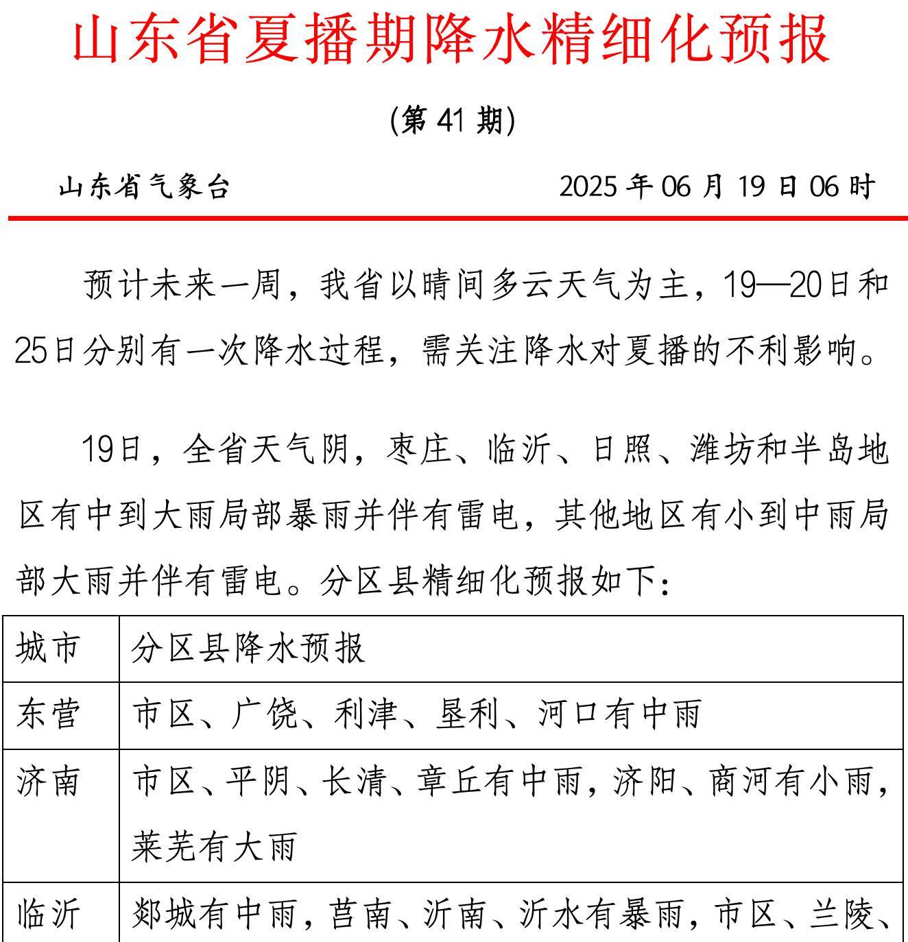 山东省气象台今天6点发布山东省夏播期降水精细化预报。预计未来一周,我省以晴间多云天气为主,19—20日和25日分别有一次降水过程,需关注降水对夏播的不利影响。