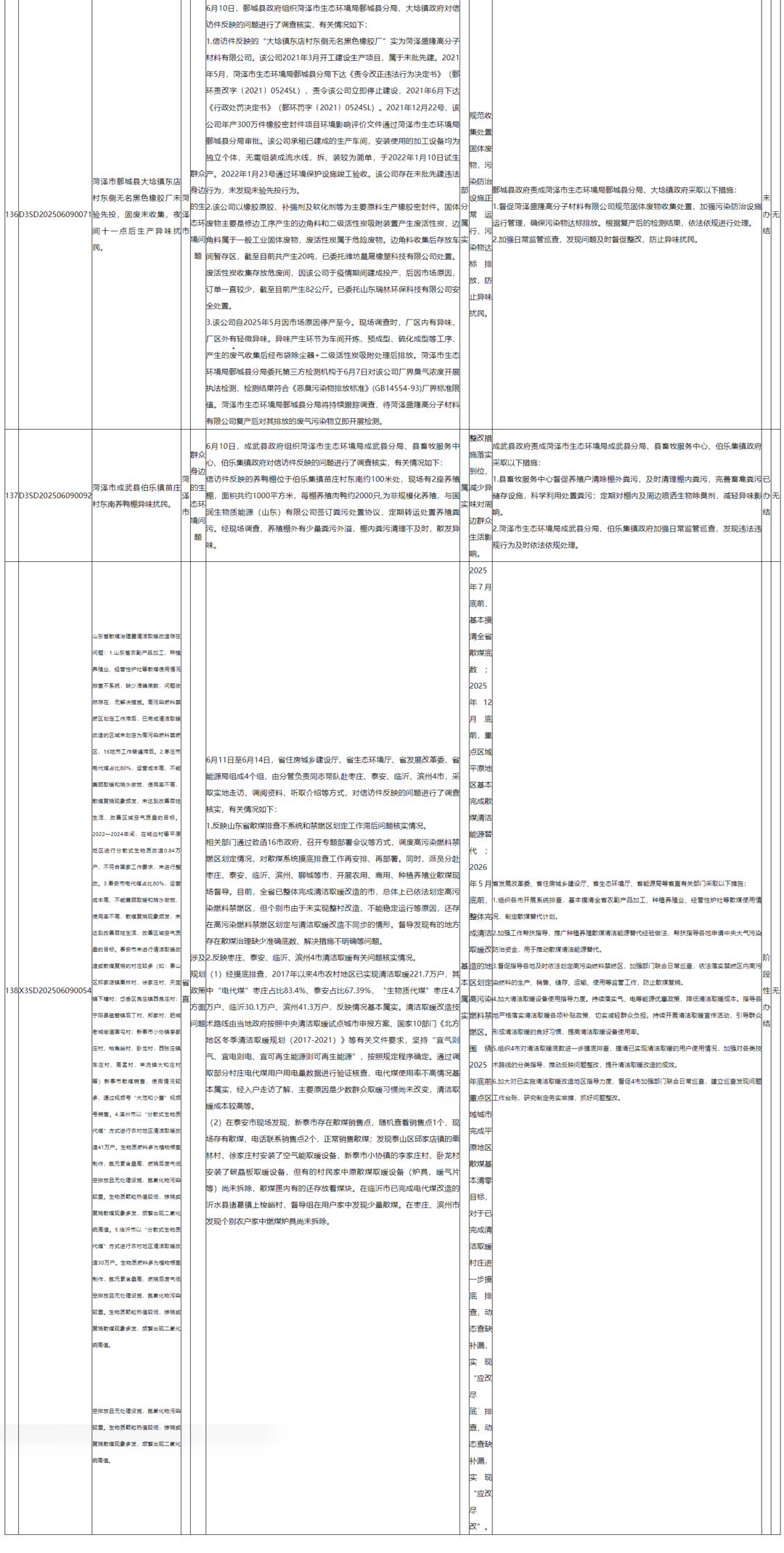 截至6月19日,中央第三生态环境保护督察组交办山东省的第十四批138件信访件,已办结71件,阶段性办结52件,未办结15件。其中,责令整改17家,立案处罚3家。根据督察要求,现予以公开。