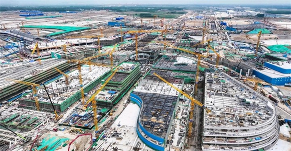 目前,机场工程60万平方米T2航站楼及指廊各区域快速推进,高达99.8米、全国首个具备三层指挥层的机场塔台主体结构封顶并完成筒外钢结构吊装。