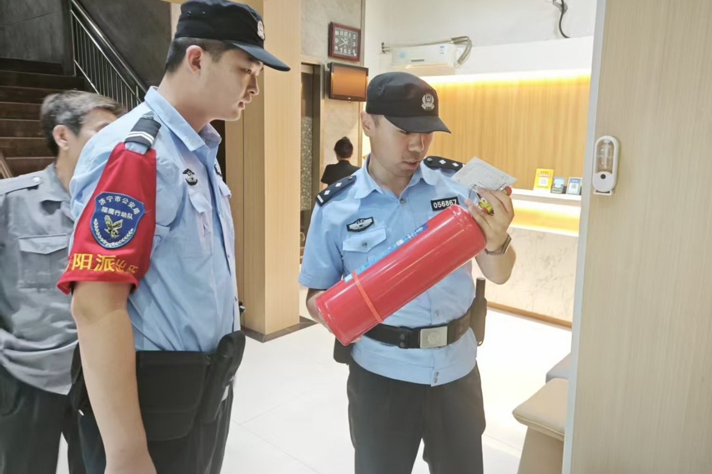 “灭火器应摆放在店内非常显眼的位置,而且应急时易于拿取……”6月17日晚,济阳派出所民警带领辅警来到辖区内美心酒店、漫悦酒店等处进行检查,重点排查电气线路是否有暴露老化现象,消防通道是否畅通、有无杂物堆放情况,灭火器是否做好日常维护等,对发现的问题当场指出督促立即整改,并采取发放资料、讲解典型案例的方式,普及防火、防盗、反诈等安全常识。共检查宾馆4家,发现督促整改安全隐患1处,进一步提升了宾馆从业人员的消防意识和能力,规范了宾馆依法安全经营行为,取得了良好社会效果。