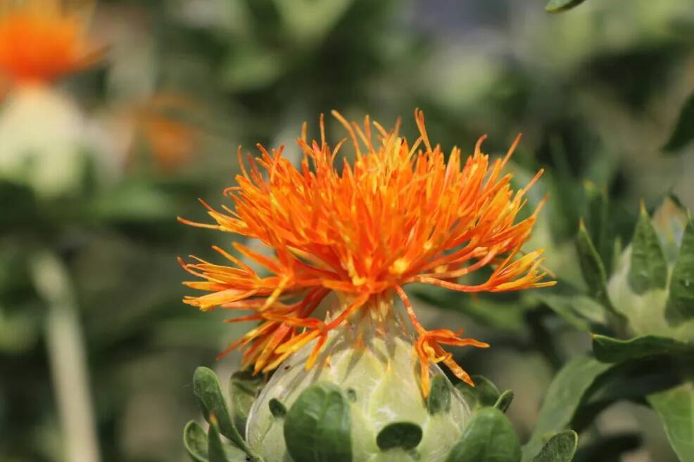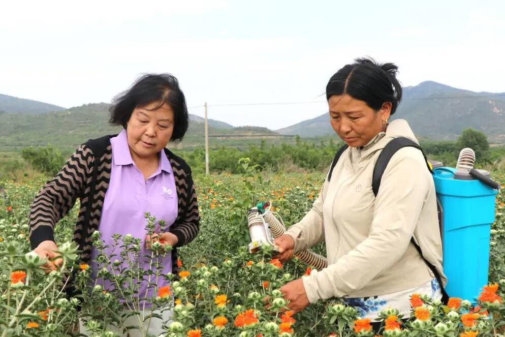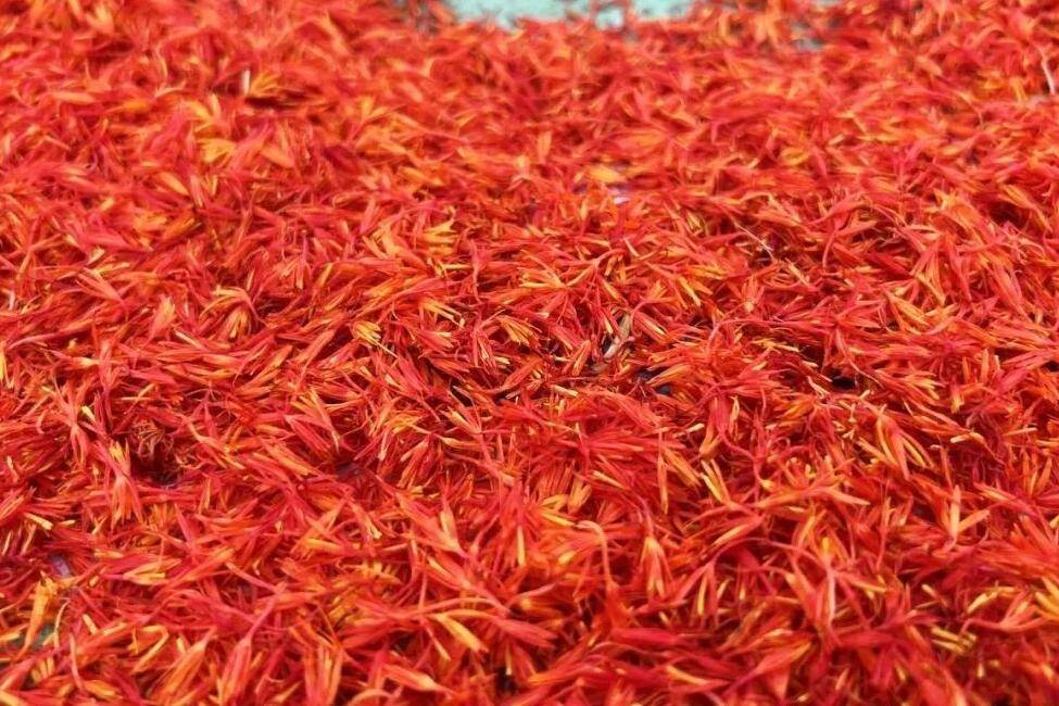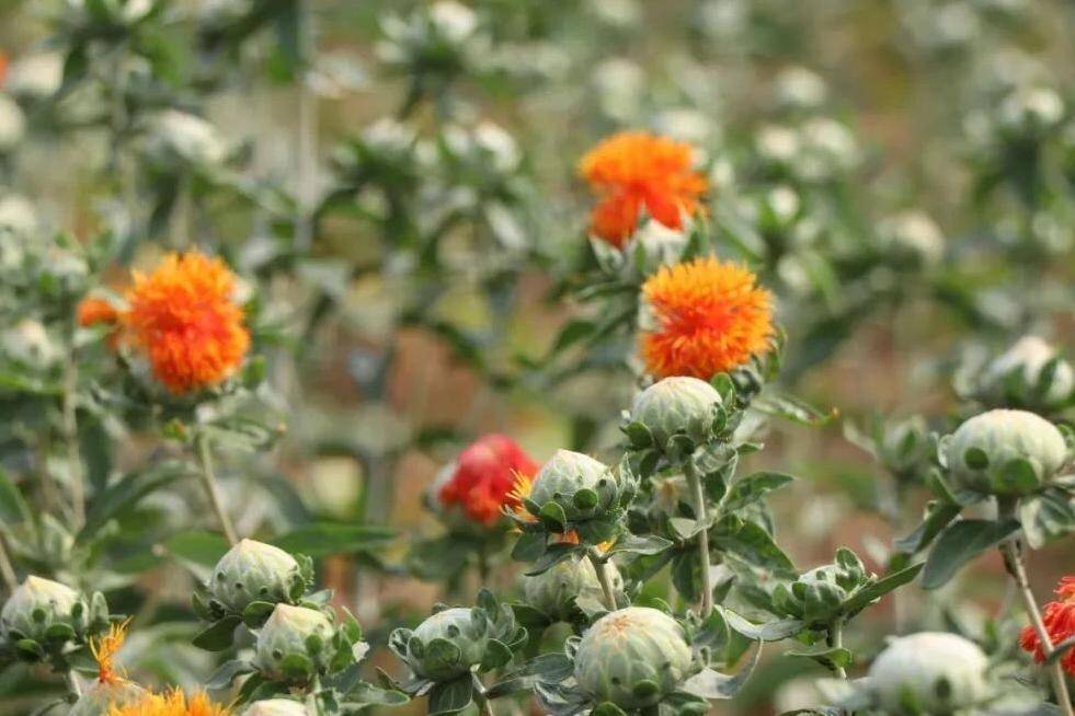 田国民在花田间信心满满地说:“这里的地理环境和气候条件特别适合红花生长,我们村集体今年扩种到了40亩!”