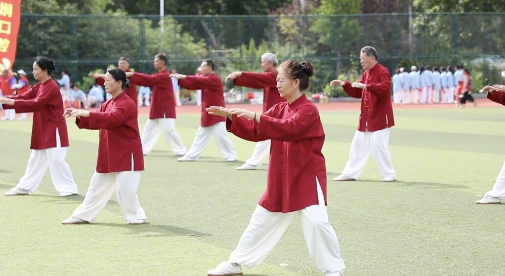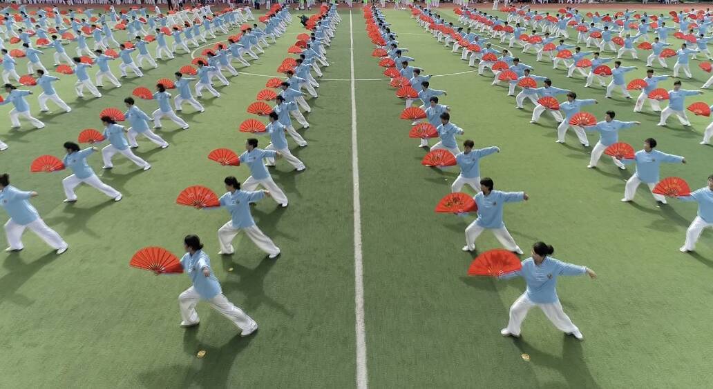 展演在铿锵有力的大鼓声中拉开帷幕,随后,由来自新泰市44个太极拳代表队、1100多名太极拳爱好者带来的《八段锦功法》 和《太极功夫扇》将现场推向高潮,一招“起势”,如云卷云舒;一式“单鞭”,似山岳凝定,动静之间,是阴阳相生的东方智慧,开合之际,显天人合一的生命境界。同时,健身操、柔力球彩带舞、春秋大刀、模特走秀、中国杆舞等表演轮番上场,再次点燃现场氛围。