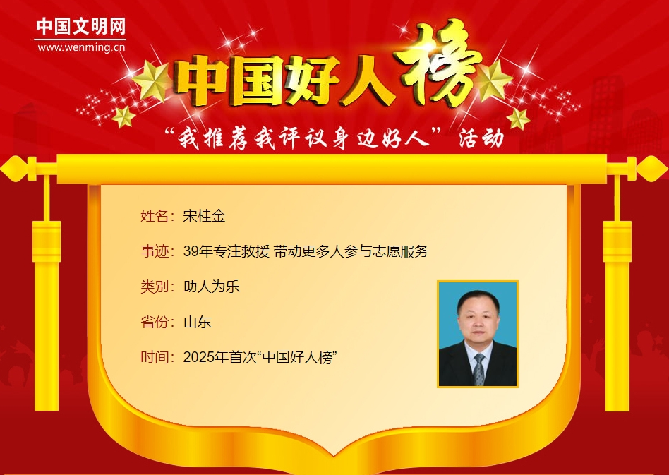 宋桂金,男,汉族,1967年11月生,中国农业银行股份有限公司梁山县支行职工,梁山大义救援队队长。39年时间里,他一心扑在公益救援事业上,足迹遍及全国16省32地(市、区),为428名走失人员照亮“回家的路”,成为当地家喻户晓的“救人专业户”。2021年、2023年,他分别带领队员奔赴河南郑州、河北涿州进行抗洪救援,帮助转移群众3200余人,用实际行动诠释了“一方有难,八方支援”的深刻内涵。