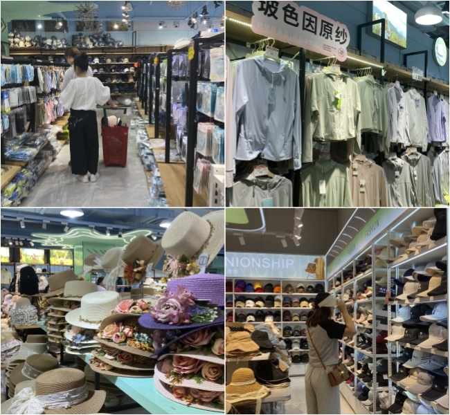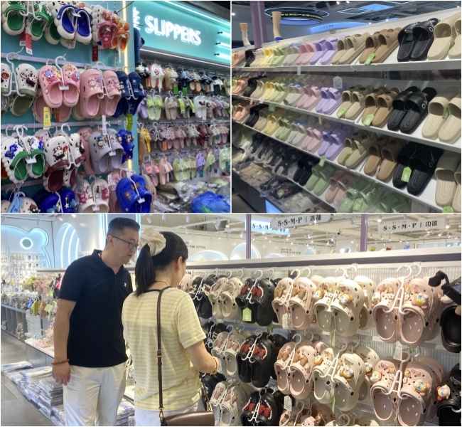 不远处,洞洞鞋、防晒衣、遮阳伞、防晒面罩等夏日商品的摊位前也围满了人。一位来自外地的采购商正仔细挑选着洞洞鞋,她指着货架上一款卡皮巴拉图案的鞋子说:“每到夏天,这种卡通洞洞鞋特别畅销,西市场的商品种类多、价格实惠,我每年都得拉两车回去。”