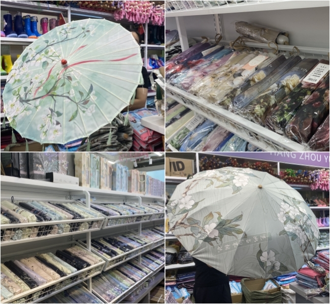 孙洪英的店里,除了洞洞鞋,还主营各种伞类商品。从表演用的油纸伞,到常见的三折伞,还有五折伞、国风伞……高中低档上千个款式。她展开一把青花瓷纹五折伞:“镁合金骨架仅重156克,97元的价格比商场便宜三成。”