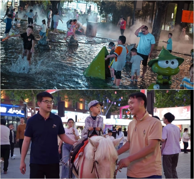 泉印广场的音乐喷泉准时启动,水柱随着音乐起伏,在灯光映射下宛如水晶柱。不远处的“星河高空漂流”项目,游客们乘坐皮筏从高空呼啸而下,响起一片欢声笑语。“我们形成了‘白昼避暑+夜间畅玩’的全天候场景。”济南泉世界商业管理有限公司商业街区事业部主管荆湘介绍,“梦之泉、声之泉等多处喷泉场地每天早中晚三场表演。”一位带着孩子的家长说:“印象济南这里特别热闹,晚上带孩子来逛逛,吃点好吃的,感觉特别惬意。”