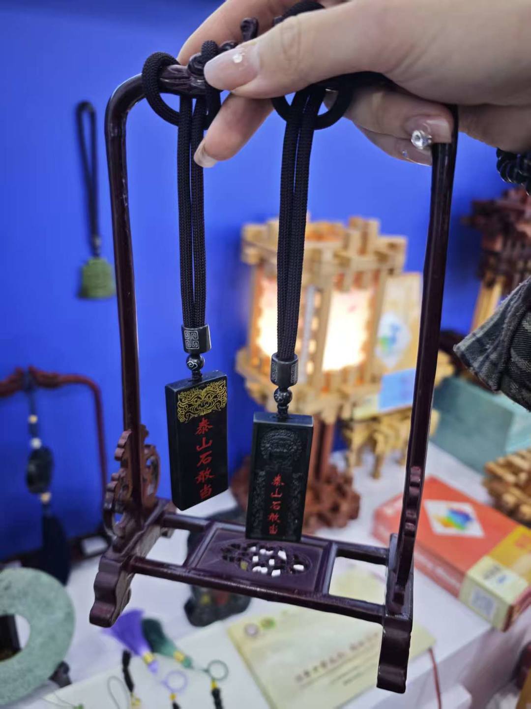 墨黑色的泰山玉散发着沉稳内敛的光泽,在济南泰崃天宝泰山玉有限公司展位前有不少文化爱好者驻足。“国泰民安”秤砣印、“鲁国大玉壁”和“一山一水一圣人”平安扣,尽显文化与匠心的融合。“我们这次带来的作品,很多是跟山东省博物馆合作开发的文创产品,希望能以玉为媒,让大家近距离感受齐鲁文化的魅力。”公司销售经理张智慧一边介绍展品,一边向记者展示一枚“泰山石敢当”小挂坠。