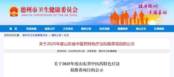 6月24日,德州市卫生健康委员会发布关于2025年度山东省中医药特色疗法拟推荐项目的公示,15个项目入选拟推荐名单。