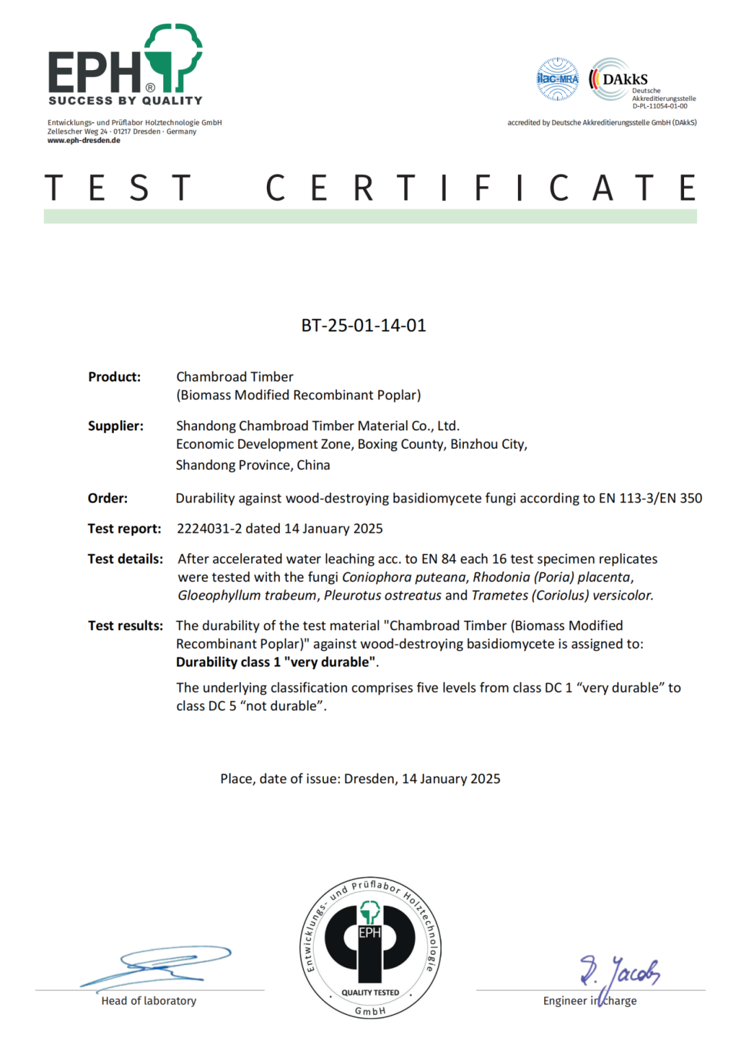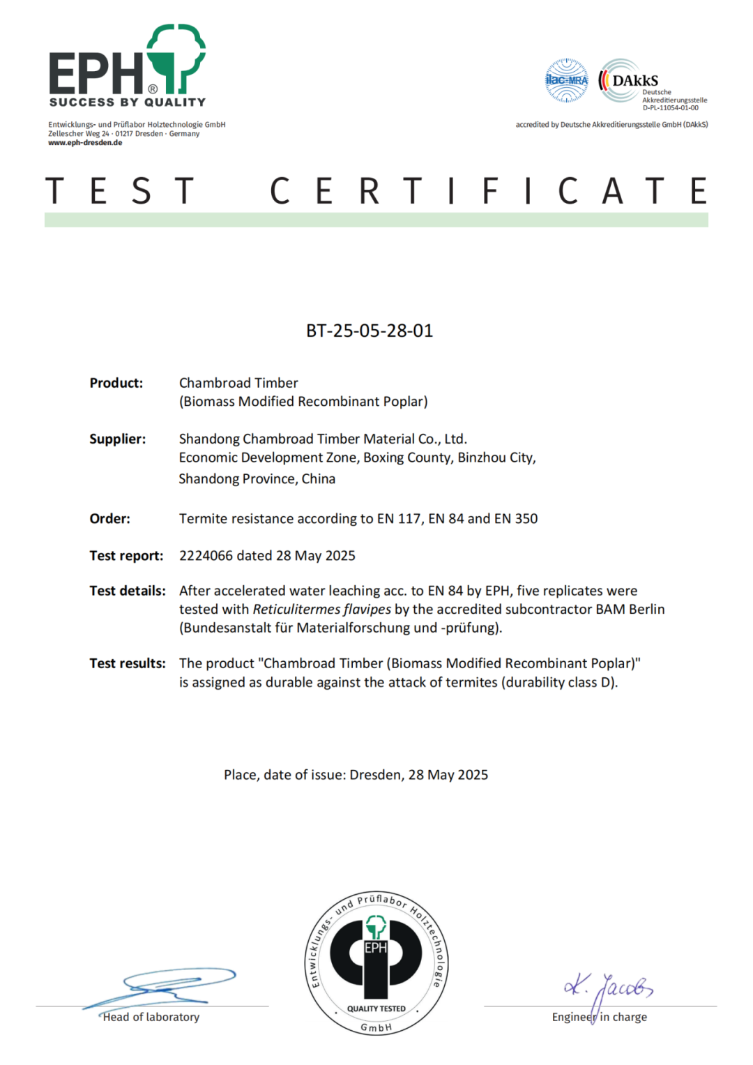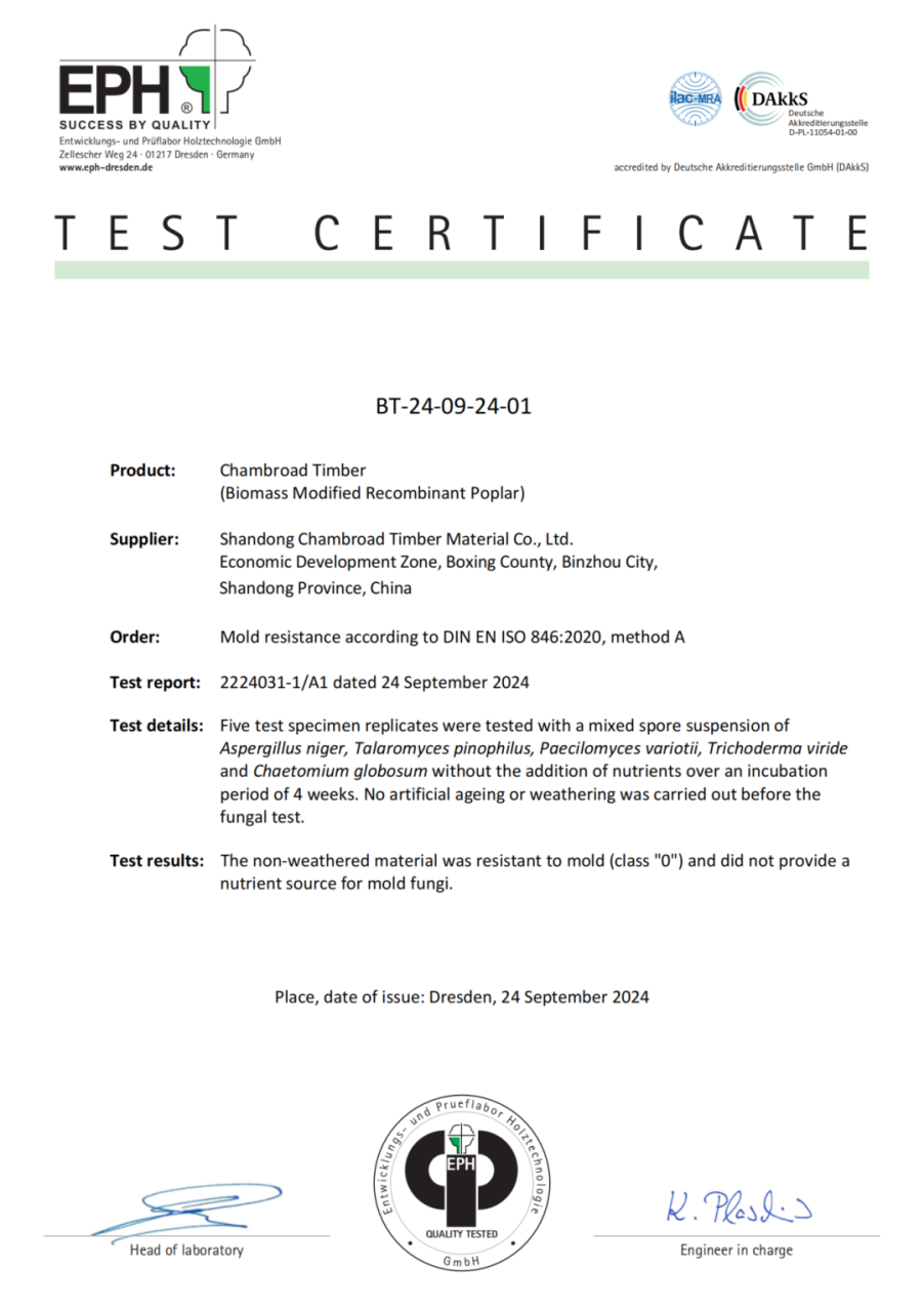在追求绿色建筑与可持续发展的今天,木材的耐久性与环保性能成为行业关注的焦点。近日,京博木基顺利通过德国EPH实验室出具的四项欧洲标准测试认证,在耐久性、防霉、防白蚁等关键性能上,均取得优异表现,为现代建筑提供了安全、耐用的解决方案。
