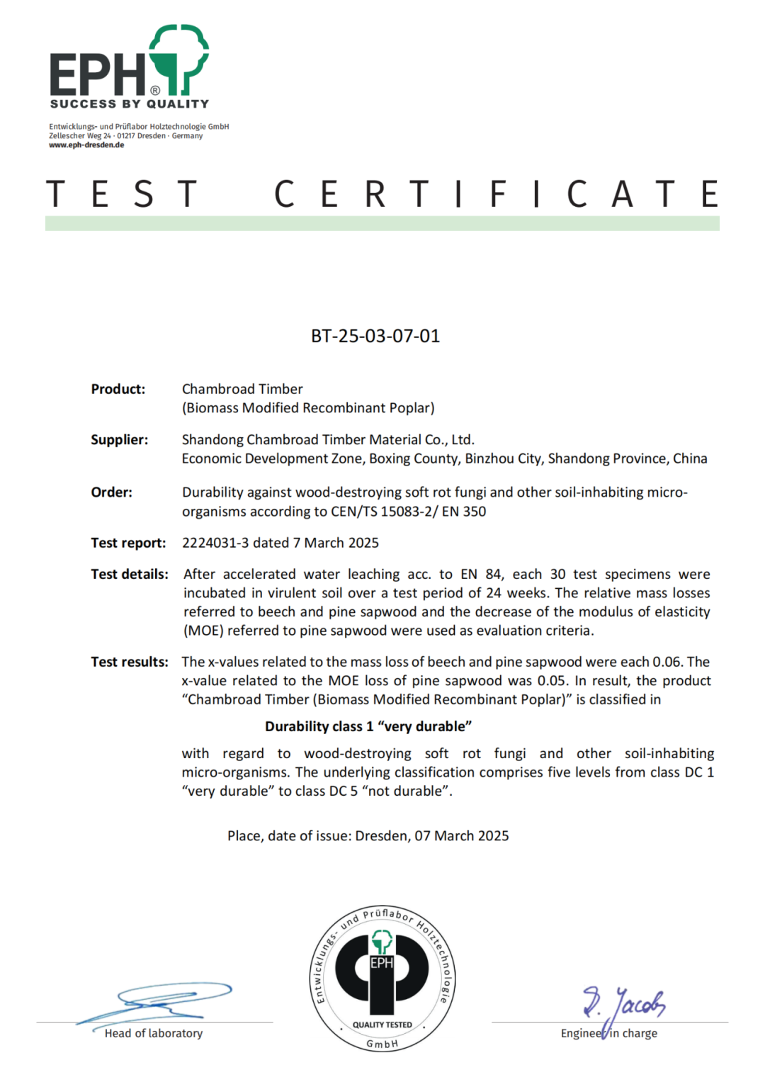 经过加速水浸处理后,Chambroad Timber在多种木材腐朽菌(如褐腐菌Coniophora puteana等)的侵蚀下,被评为耐久性等级1级(非常耐久),远超普通木材。