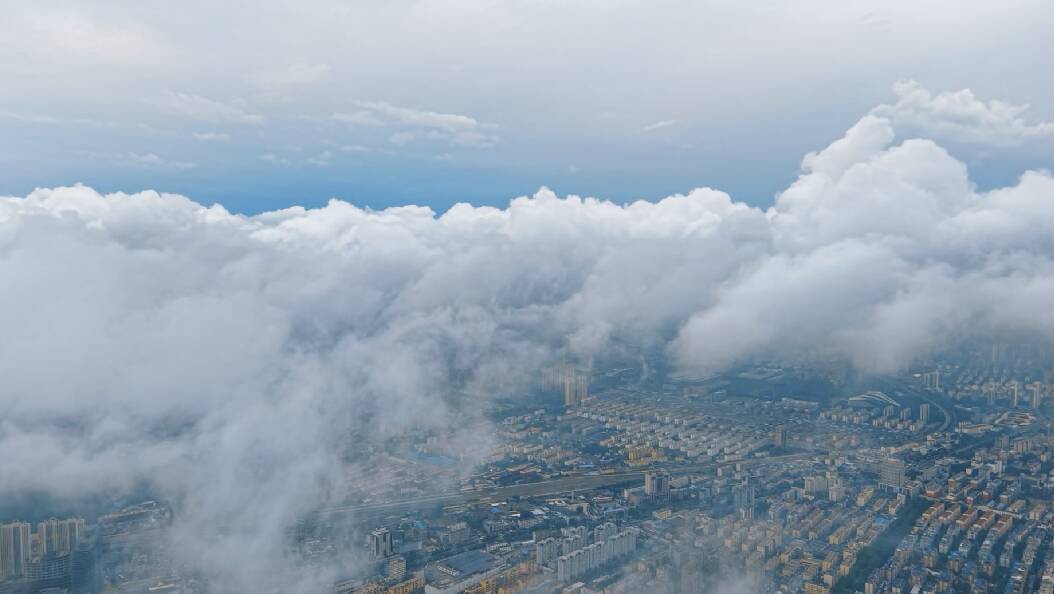 俯瞰云层之下,古老的泰安城在薄纱轻拢中渐渐苏醒,崭新楼宇在蒸腾的云气间若隐若现,人间烟火与天地奇观在此刻交融共生。