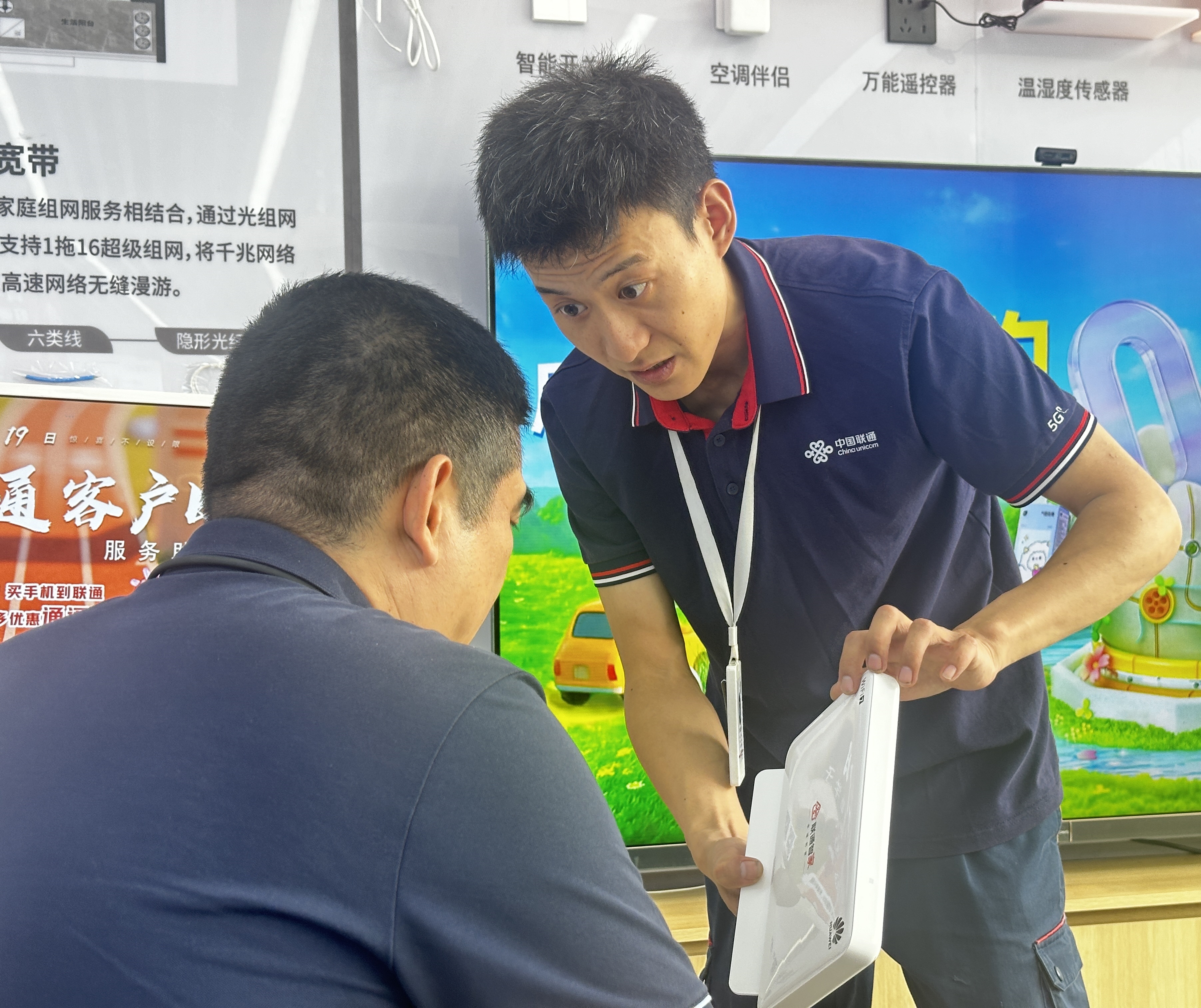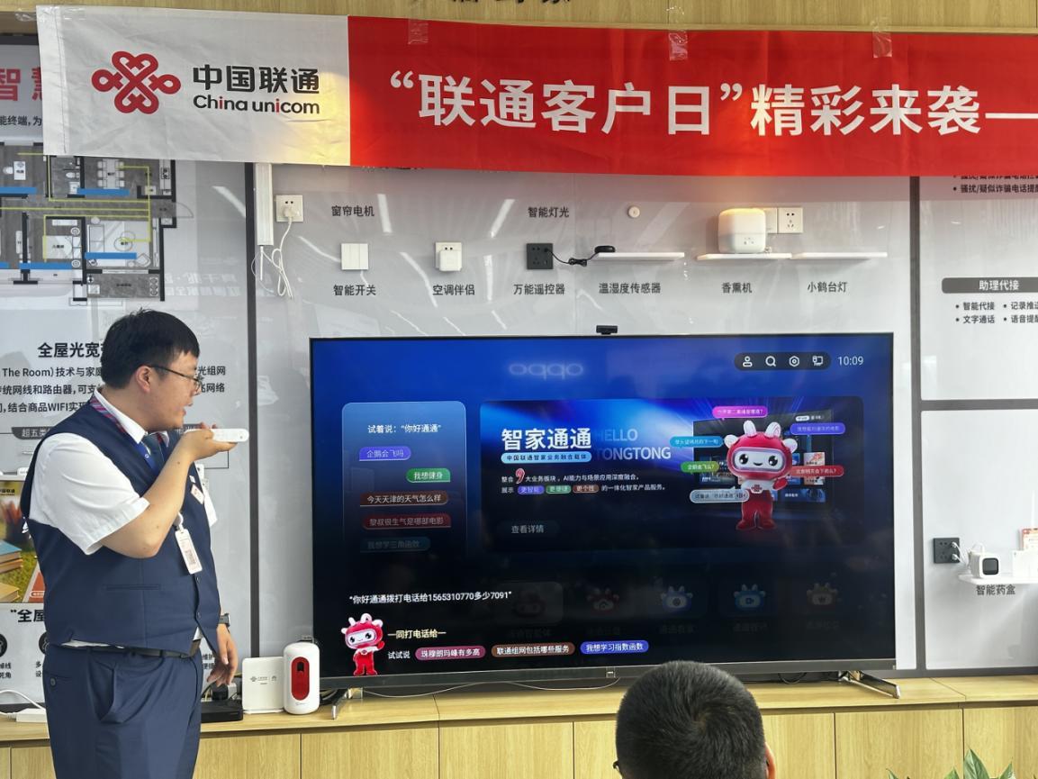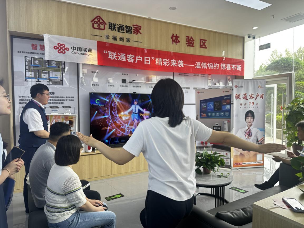 营业厅工作人员为客户深度解读“联通客户日”活动理念及本次活动的四重福利,重点宣讲“智家通通”各项功能,并通过现场演示将产品涵盖的家居安防、智能照明等9大生活场景逐一呈现。在互动体验环节,“智家通通”健身项目备受青睐,客户参与踊跃,在欢声笑语中切实感受到智慧家庭产品的科技魅力与实用价值。