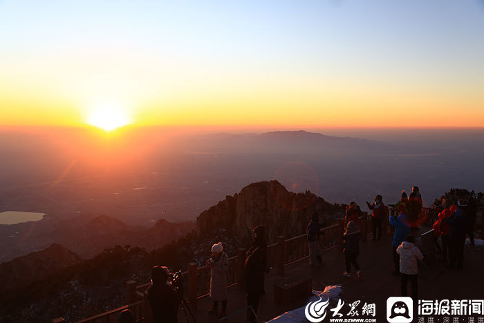 泰山日出是岱顶奇观之一,它壮观而动人心弦。随着旭日发出的第一缕曙光撕破黎明前的黑暗,从而使东方天幕由漆黑而逐渐转为鱼肚白、红色,直至耀眼的金黄,喷射出万道霞光,最后,一轮火球跃出水面,腾空而起,整个过程象一个技艺高超的魔术师,在瞬息间变幻出千万种多姿多彩的画面,令人叹为观止。
