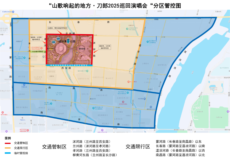 “山歌响起的地方·刀郎2025巡回演唱会-临沂站”将于2025年7月5日、6日每日19时至22时在临沂奥体公园体育馆举行。为确保活动期间道路交通安全、有序,根据《中华人民共和国道路交通安全法》及相关法律规定,公安机关交通管理部门决定对临沂奥体公园周边区域及道路分时、分段实施临时交通管制。现将相关事宜通告如下: