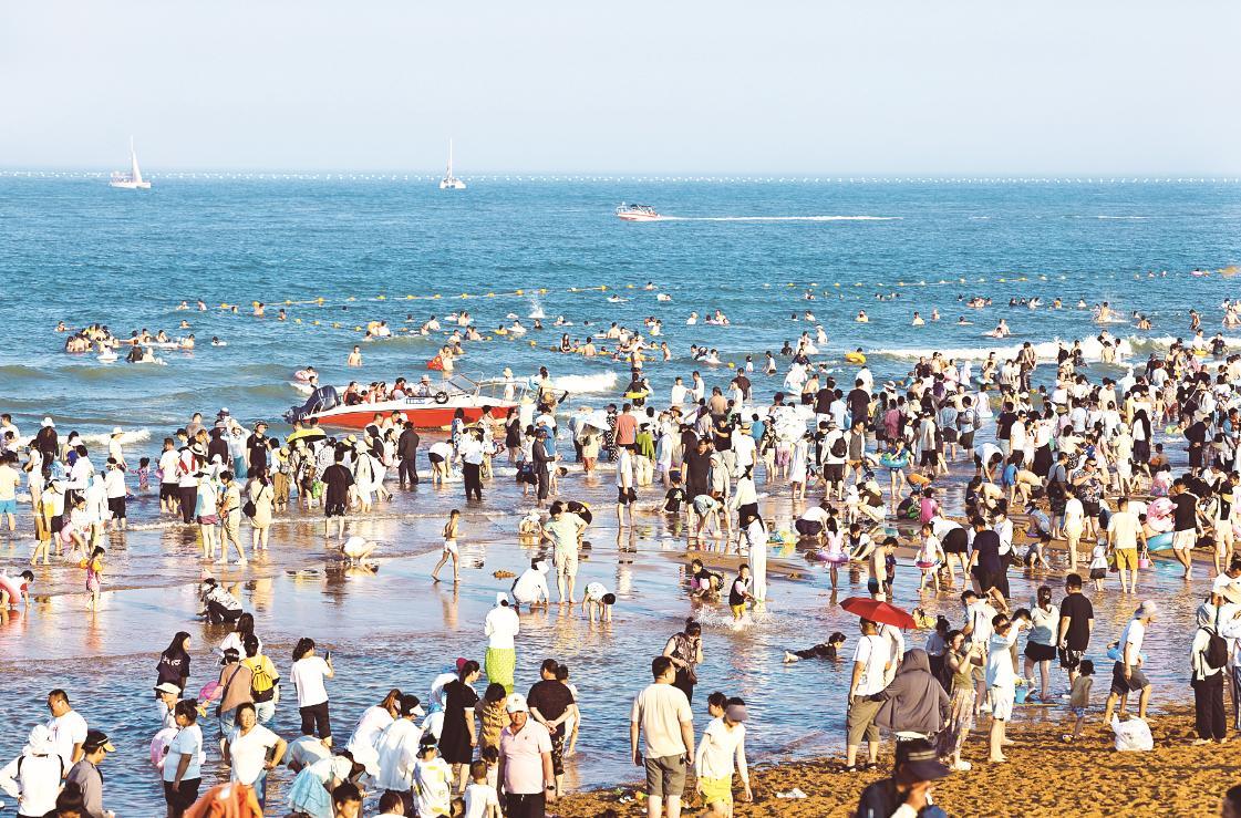 近日,日照万平口景区游人如织。炎炎夏日,日照海滨迎来旅游旺季。澄澈碧海与金沙滩间,挤满戏水纳凉的游客,彩色泳圈随浪起伏,欢声笑语与海浪声交织,尽显夏日海滨度假的热闹与惬意,诠释着日照作为海滨旅游胜地的独特魅力。