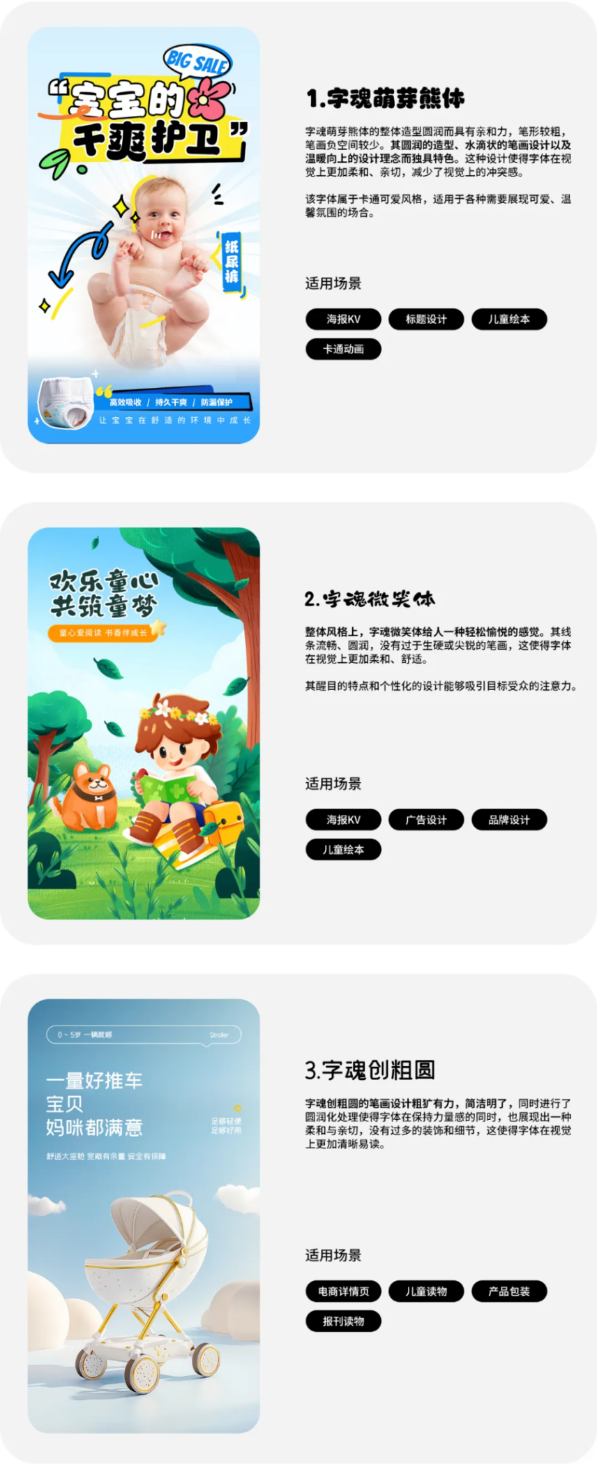 针对儿童设计的母婴产品,如教育玩具、儿童图书等,则更倾向于采用活泼、有趣的字体,如:字魂流氓兔体、字魂漫画家、字魂冰淇淋、字魂甜心泡泡体等。