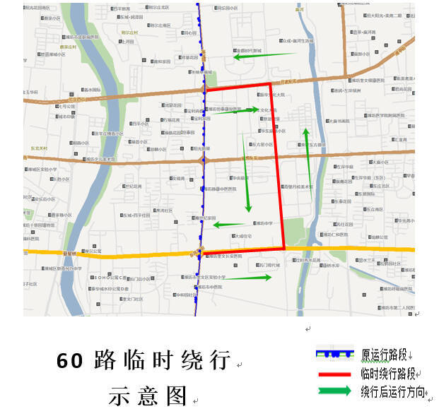 60路下行方向:车辆从前阙庄村发车,沿原线路运行至潍州路北宫街路口后,沿北宫街-鸢飞路-东风街-潍州路南行恢复原线路运行,不再运行潍州路(北宫街至东风街)路段(上行方向反之亦然)。