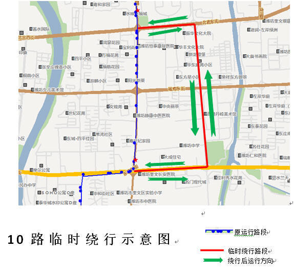 10路上行方向:车辆从火车站南广场发车,沿原线路运行至东风街潍州路路口后,沿东风街-鸢飞路-北宫街-潍州路北行恢复原线路运行,不再运行潍州路(东风街至北宫街)路段(下行反之亦然)。
