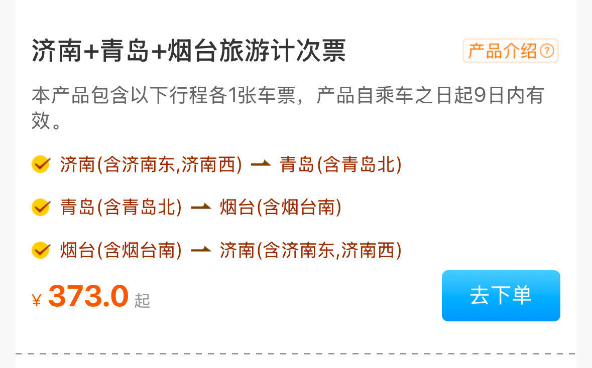 4条线路设计满足多种旅游需求。本次推出的旅游计次票产品是精心设计的4条暑期热门旅游线路的组合。其中“济南+青岛+烟台” 旅游计次票包含济南(济南东/济南西)至青岛(青岛北)、青岛(青岛北)至烟台(烟台南)、烟台(烟台南)至济南(济南东/济南西)各1张二等座车票。“济南+曲阜+泰安” 旅游计次票包含济南(济南东/济南西)至曲阜东、曲阜东至泰安、泰安至济南(济南东/济南西)各1张二等座车票。“济南+淄博+潍坊+青岛”旅游计次票包含济南(济南东/济南西)至淄博(淄博北)、淄博(淄博北)至潍坊(潍坊北)、潍坊(潍坊北)至青岛(青岛北)各1张二等座车票。“青岛+威海+烟台”旅游计次票包含青岛(青岛北)至威海(威海北)、威海(威海北)至烟台(烟台南)、烟台(烟台南)至青岛(青岛北)各1张二等座车票。
