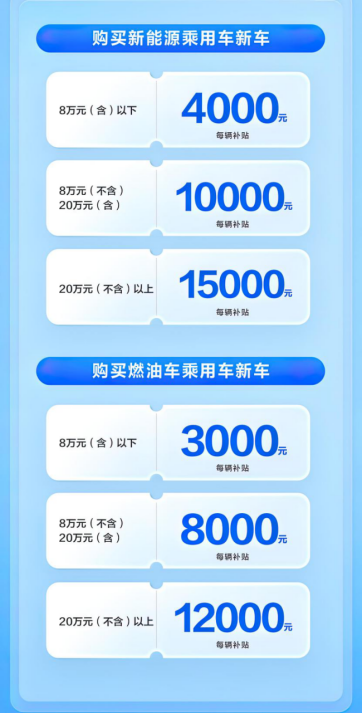 计划申请山东省汽车置换更新补贴的消费者,应在2025年转让本人名下旧乘用车,在山东省购买新乘用车并开具发票;其中旧车需要在2025年1月8日前登记在本人名下。按照购车发票含税金额,如果置换燃油车,购车价格8万元(含)以下的每辆补贴3000元,价格8万元(不含)至20万元(含)的每辆补贴8000元,价格20万元(不含)以上的每辆补贴12000元;如果置换新能源车,购车价格8万元(含)以下的每辆补贴4000元,价格8万元(不含)至20万元(含)的每辆补贴10000元,价格20万元(不含)以上的每辆补贴15000元。
