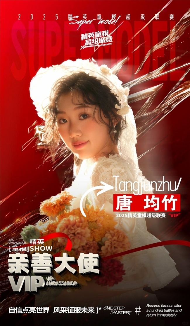 唐均竹出生于内蒙古呼伦贝尔,广袤的草原赋予她蒙古族儿女特有的坚韧与灵性。自幼接受澜航教育系统化培养的她,在模特、舞蹈、声乐、古筝等16项艺术领域展现出惊人天赋。2024年,她以“六边形战士”之姿横扫精英童模超级联赛,斩获全球人气偶像季军、个人礼服赛冠军、DOV亮福模特十佳、团队赛亚军四项大奖,其舞台表现被组委会评价为“将草原的辽阔与都市的摩登完美融合”。在2024精英童模超级联赛的舞台上,她以一颗赤子之心,诠释了美的真谛,展现了内蒙古儿女的风采。我们相信,在未来的日子里,这位来自内蒙古澜航教育的小超模,定将如同草原上的雄鹰,翱翔于更广阔的天空,书写属于自己的传奇篇章。同时我们也期待着这次她的成都的精彩表现。