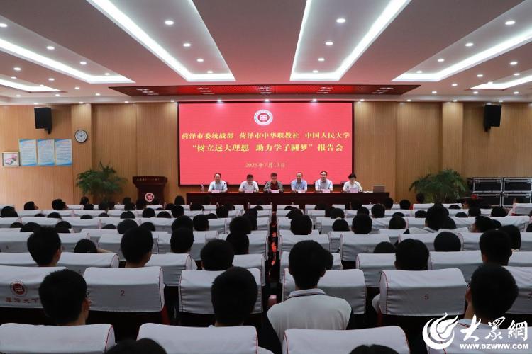 7月13日,由菏泽市委统战部、菏泽市中华职教社、中国人民大学共同主办的“树立远大理想 助力学子圆梦”报告会暨菏泽市中华职教社“同心优培”工程主题活动在菏泽一中举办。市政协副主席、市中华职教社主任、民革市委会主委赵胜利,市委统战部分管日常工作的副部长王本现出席会议。菏泽一中新高三的260余名学生认真聆听了报告会,并参加了现场互动。