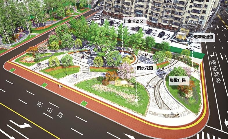 作为这处新口袋公园的两大亮点,儿童游乐广场将游园中心处的3个圆形场地设置为儿童游乐区,内部设置下沉游乐区域并布置游乐设施,周边以木质座椅作为围合,为家长提供看护空间。广场可供市民休闲、跳广场舞、滑轮滑等。活动区交会处设置带状座椅,为参与活动的市民提供休息等候区,公园还将加入雨水花园等海绵城市设施,并增设无障碍通道,各年龄段的周边居民,都能在这处新“打卡地”自得其乐。