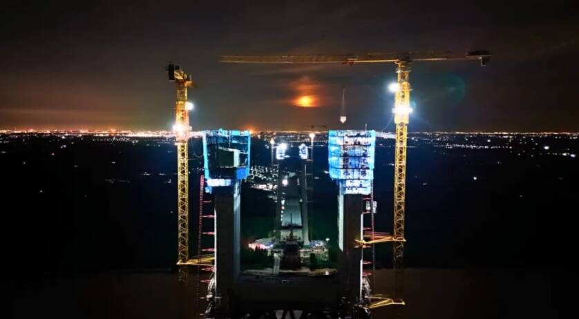 随着568号主塔完成封顶,东营侧569号主塔开足马力战高温促生产,目前已施工至第31节,计划8月底完成封顶;主桥钢梁亦已架设完成60个节间,进入跨中悬臂架梁阶段;东西两岸引桥同步推进公路箱梁施工,预计2025年底主体工程圆满收官。