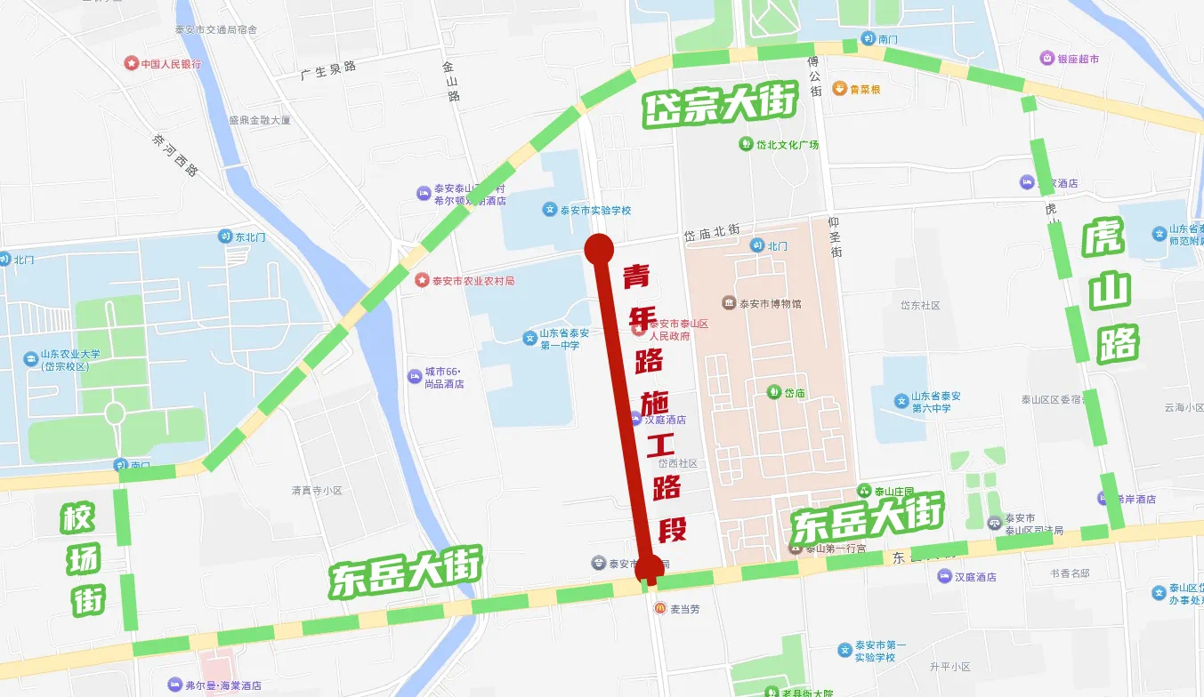 过往机动车需提前规划出行路线,建议绕行东岳大街、岱宗大街、校场街、虎山路等周边道路。受施工影响,途经该区域的3路、36路、39路、45路共4条公交线路将临时调整运行路线。具体调整包括3路、36路、39路、45路将分别暂不停靠林校操场、泰安一中、公安局(岱庙)、山东科技大学东校区、农业大学、岱宗大街㴎河西路路口等站点,临时增加停靠山东科技大学东校区、虎山路北段、虎山路中段、泰山区委区政府、岱庙(泰山区人民医院)、泰建集团、上河桥等站点。公交线路将在施工结束并具备安全通行条件后立即恢复原路线。