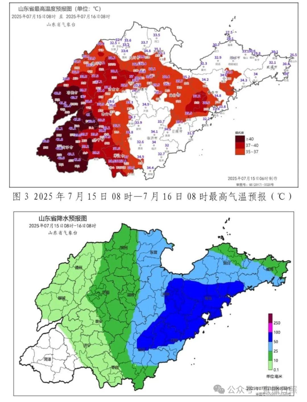 最高气温:菏泽、济宁、枣庄西部、泰安西部、聊城和济南南部38~40℃,局部42℃以上,鲁中山区和沿海地区29~32℃,其他地区33~36℃。