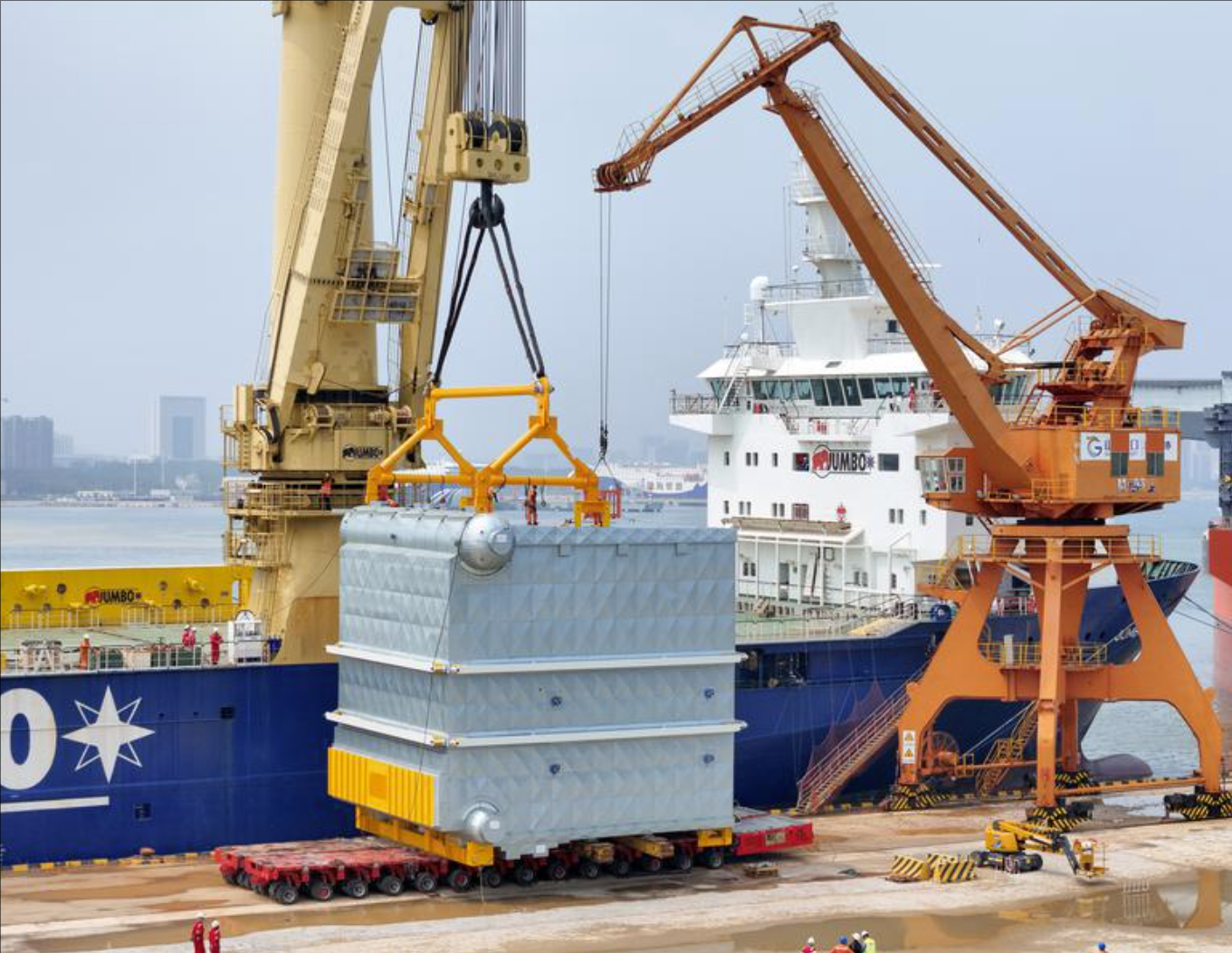 7月13日,一台重达495吨的超大型工业锅炉模块在山东港口烟台港蓬莱港区顺利装船,并出口运往卡塔尔,创下国内工业锅炉模块出口单体最重装船纪录。作为山东省港口集团件杂货基地,烟台港充分发挥港口物流枢纽和供应链节点作用,以“适配全球件杂货物流需求,构筑中国制造出海枢纽”为定位,为品类繁杂、规格各异的非标准货物提供全链条综合服务。( YMG全媒体记者 唐克 通讯员 王延达 摄)