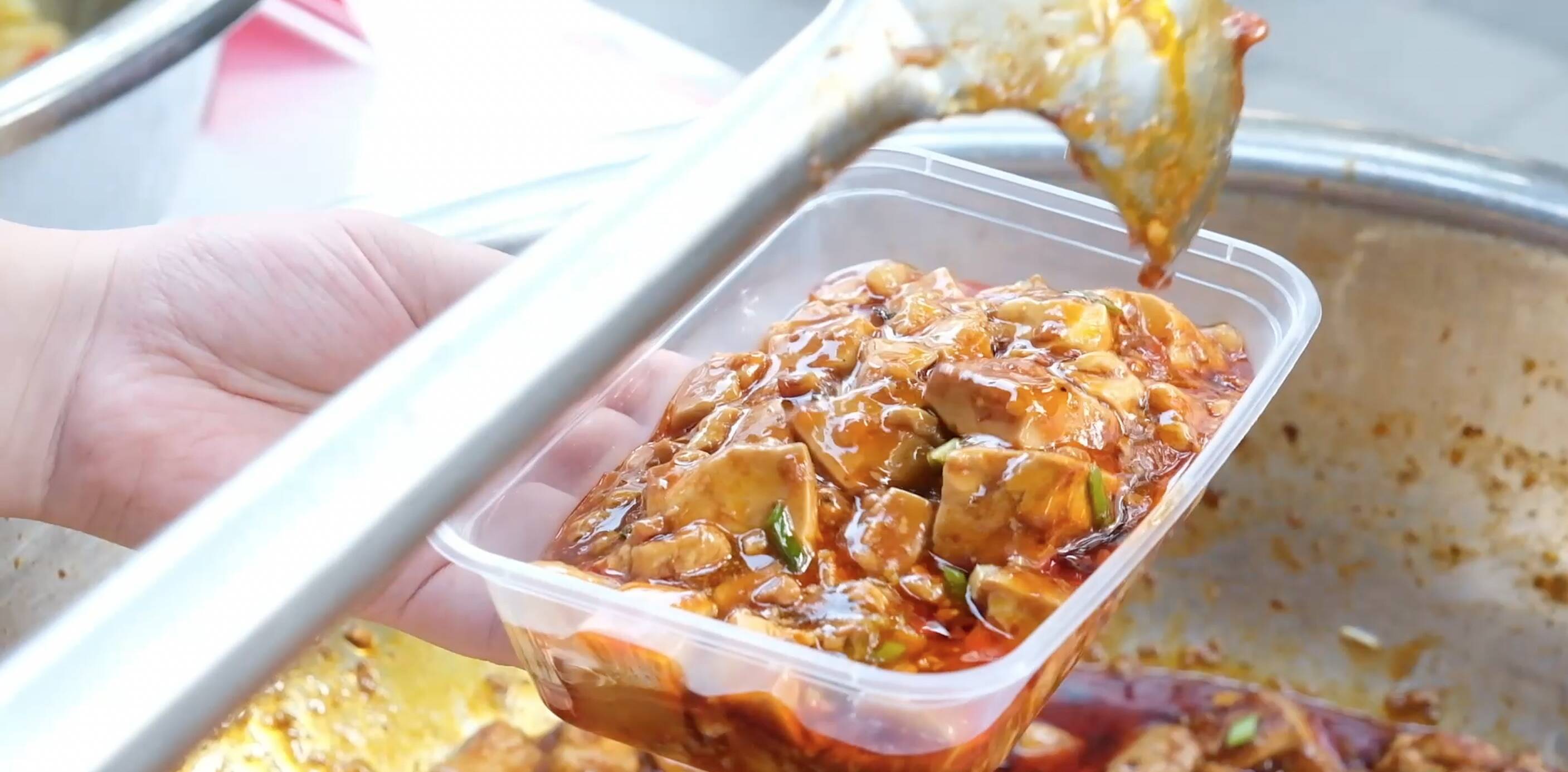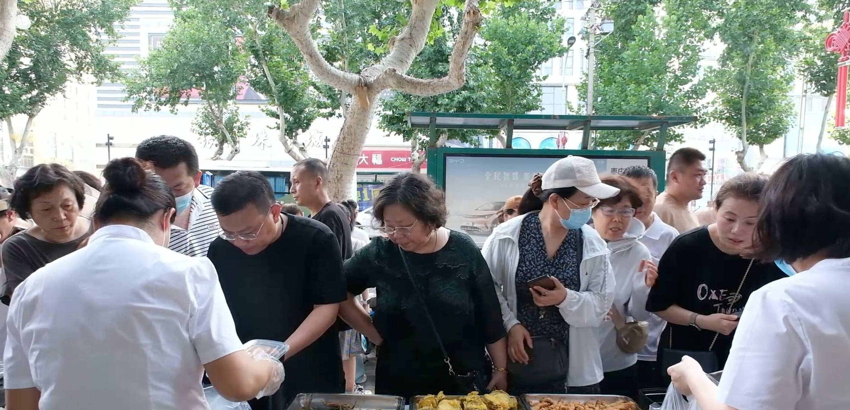 7月14日,在枣庄大酒店西门门口可以看到,外卖摊位一字排开,辣子鸡、小酥肉、红烧茄子等28道家常菜被端上摊位,香气四溢。尽管天气较为炎热,前来购买的市民却热度不减,排起了长长的队伍。