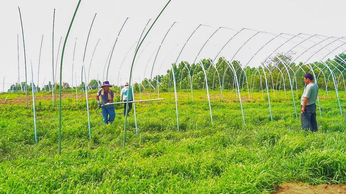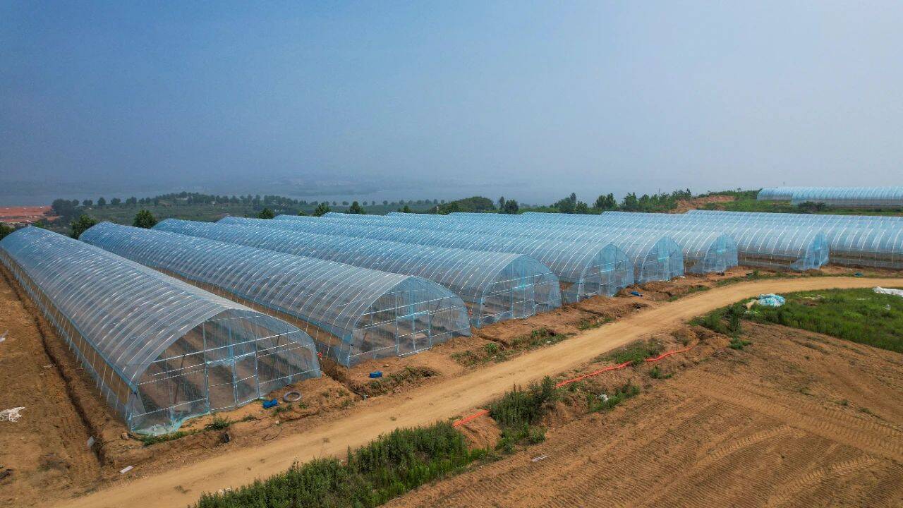 走近这个项目,几名工人还在抓紧安装大棚的框架结构。“目前一期项目已经建成了30多个大棚,计划在8月底前要建100个左右。”现场的一位技术人员介绍说。