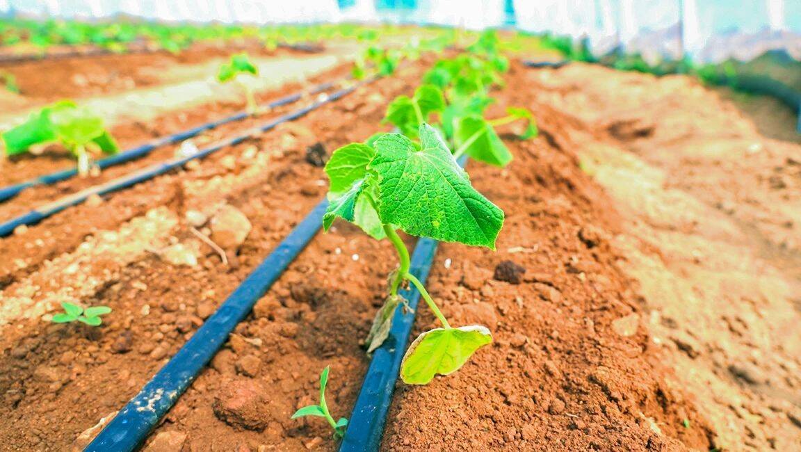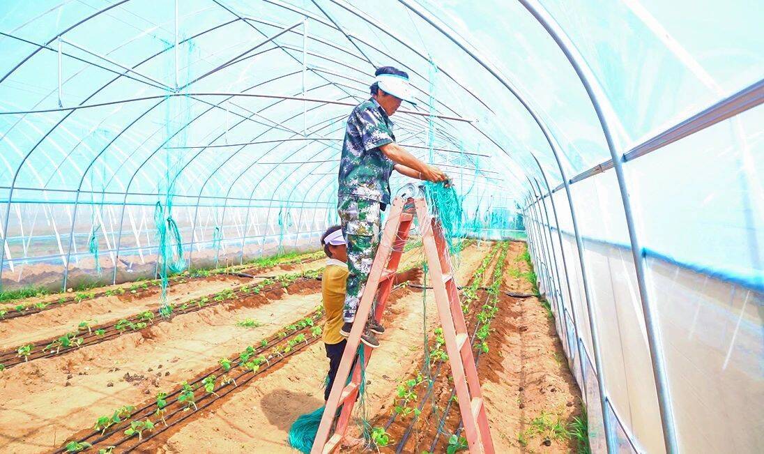 在已经建好的大棚里,刚刚栽种不久的黄瓜苗整整齐齐地排列着,田垄上还铺设了滴灌设备,工人们则忙着在大棚里系上绳子,为黄瓜蔓的向上生长打好基础。
