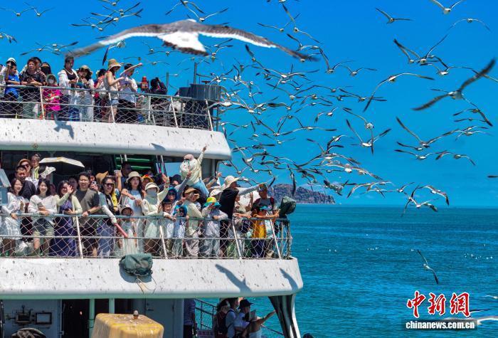 近日,山东省荣成市海驴岛迎来旅游高峰,游客在山海间享受夏日时光。当地近年来依托海岛资源,打造了海驴岛、鸡鸣岛等一批生态旅游目的地,暑期海岛旅游经济呈现火热景象。(无人机照片)李信君 摄