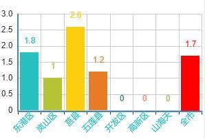 东港区1.8毫米,岚山区1.0毫米,莒县2.6毫米,五莲县1.2毫米,开发区0.0毫米,高新区0.0毫米,山海天0.0毫米,点降水量前三位站点:莒县桑园站(水文)21.5毫米、莒县大岔河站(水文)20.0毫米、莒县桑园镇站(气象)18.5毫米;日照水库流域平均2.5毫米,青峰岭水库流域平均7.8毫米,仕阳水库流域平均12.5毫米。