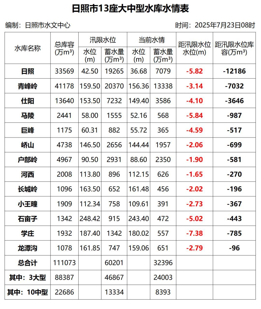 2025年7月23日8时全市13座大中型水库总蓄水量3.24亿立方米,比历年同期偏多16.5%,比2024年同期偏少22.2%,3座大型水库:日照水库7079万立方米、青峰岭水库13338万立方米、仕阳水库3586万立方米。10座中型水库共蓄水8393万立方米。
