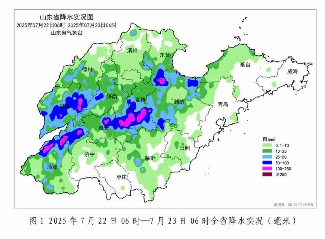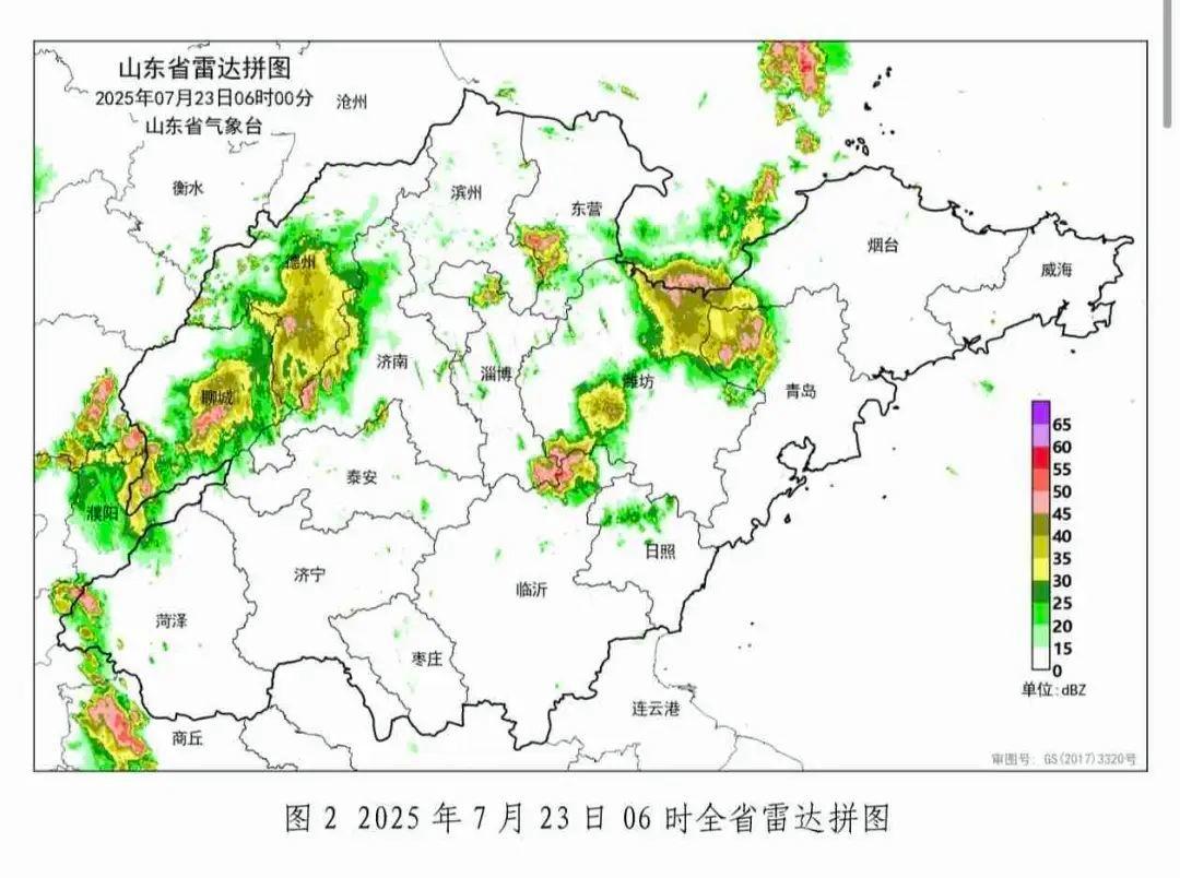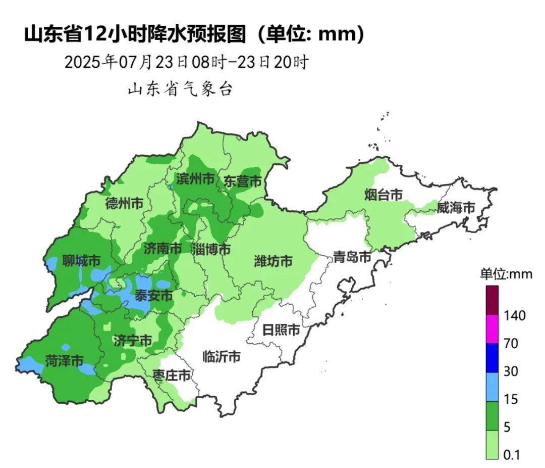 22日白天到夜间,菏泽、聊城、德州南部、东营南部、济南、泰安、淄博和潍坊北部出现了中到大雨局部暴雨或大暴雨。预计,23日白天到夜间,济南、泰安、淄博、潍坊、菏泽、济宁、聊城、德州、滨州和东营天气阴有雷雨或阵雨局部大雨或暴雨,其他地区天气多云间阴局部有雷雨或阵雨。雷雨地区雷雨时阵风7~9级。