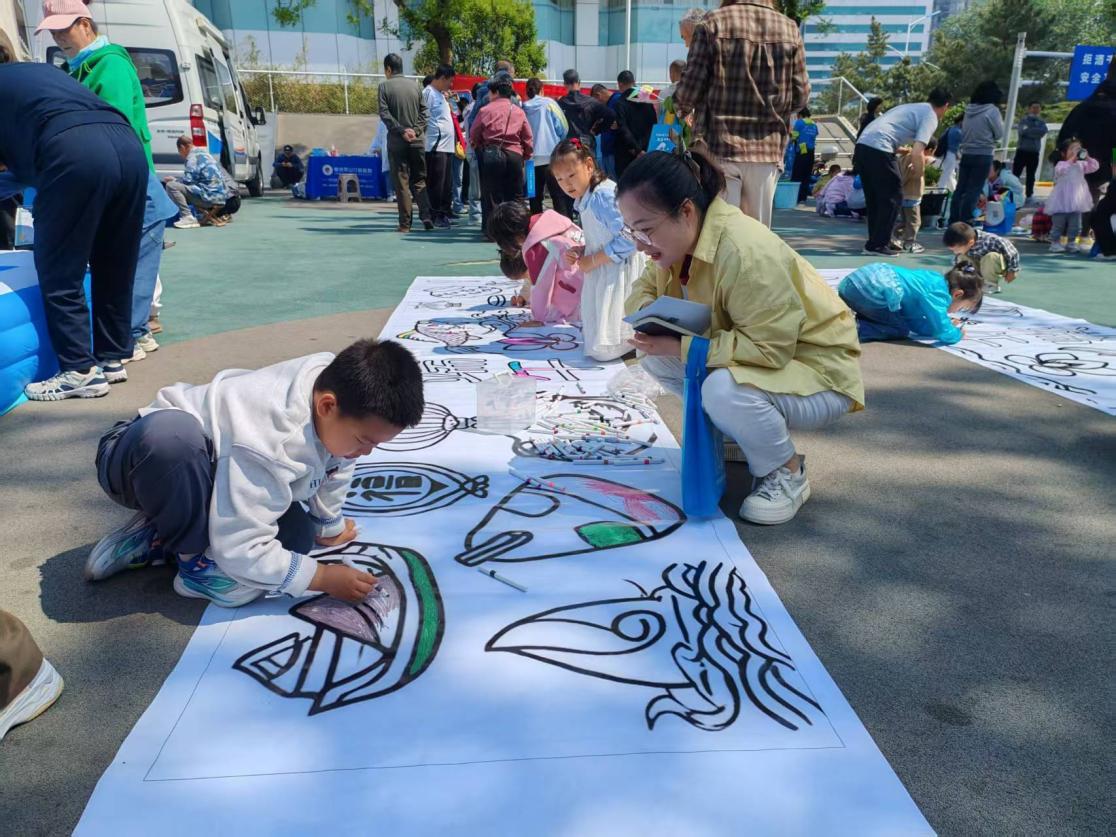 活动刚开场,广场中央的画布就被孩子们团团围住 —— 这是烟台新东方工作人员提前准备好的画布,上面印着轮廓清晰的花草、树木、动物剪影,正等待孩子们用颜料赋予它鲜活色彩。现场的孩子们轮流上阵,原本简洁的轮廓逐渐变成一幅色彩斑斓的 “绿色家园图”,这幅凝聚了小朋友们创意的长卷,成了最特别的环保宣传画。