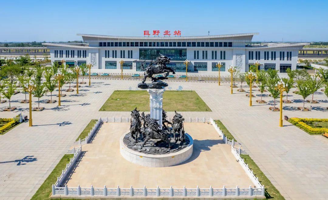 巨野北站采取了“祥瑞麒麟”的设计理念,整体造型由“麒麟”抽象演变而成,与当地“西狩获麟”的美丽传说相呼应。站前广场矗立着巨型雕塑“麒麟盛世”,由五尊麒麟组雕而成,造型灵动而不失威严。
