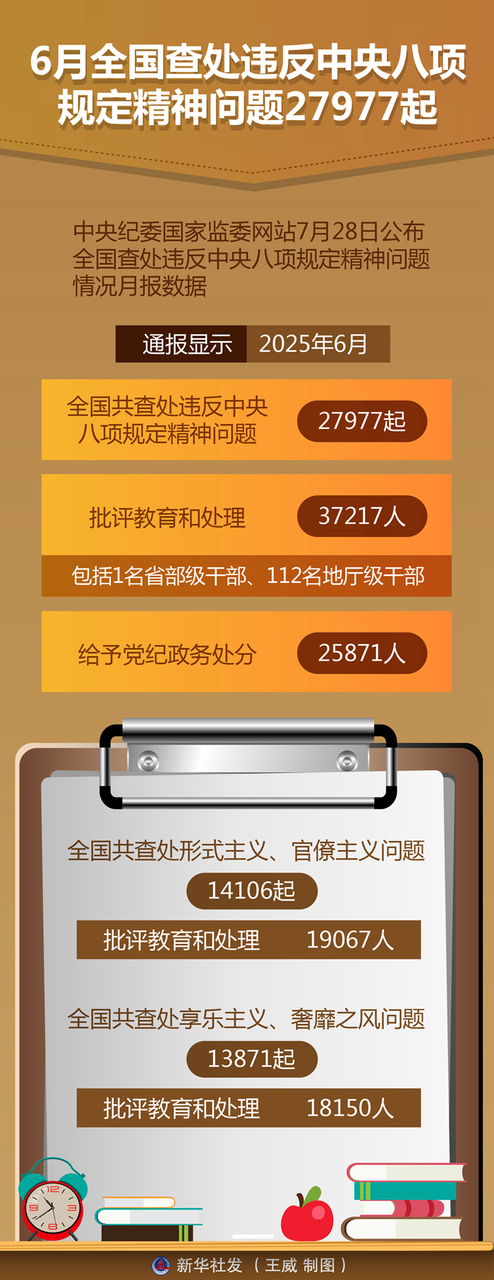 新华社北京7月28日电(记者孙少龙)中央纪委国家监委网站28日公布全国查处违反中央八项规定精神问题情况月报数据。通报显示,今年6月,全国共查处违反中央八项规定精神问题27977起,批评教育和处理37217人(包括1名省部级干部、112名地厅级干部),给予党纪政务处分25871人。