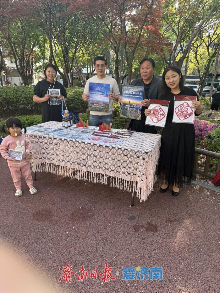 活动现场,一份份精美的济南市城市明信片整齐排列,吸引着众多当地居民的目光。这些明信片宛如济南的小小窗口,将趵突泉的灵动、大明湖的秀美、千佛山的巍峨等标志性景观浓缩于一方纸面,向人们诉说着济南的山水之美与历史底蕴。每一张明信片都是一封来自济南的友好信笺,传递着这座城市的文化温度与独特风情,让观者仿佛置身于泉城的诗意画卷之中,领略济南“四面荷花三面柳,一城山色半城湖”的绝美风光。