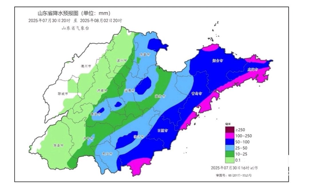 降雨:30日夜间台风“竹节草”外围云系开始影响我省,强降水落区位于我省中东部地区,主要集中在31日白天至8月1日白天,伴有短时强降水、雷电和8~10级雷雨阵风,最大1小时降水量60~100毫米,全省累积平均降水量20~40毫米。其中,临沂、日照、潍坊、青岛、烟台和威海有大到暴雨局部大暴雨或特大暴雨(40~80毫米局部300毫米以上),东营、淄博、济南东部、泰安东部、济宁东部和枣庄有小到中雨局部大雨或暴雨(5~15毫米局部50毫米以上),其他地区有雷雨或阵雨。