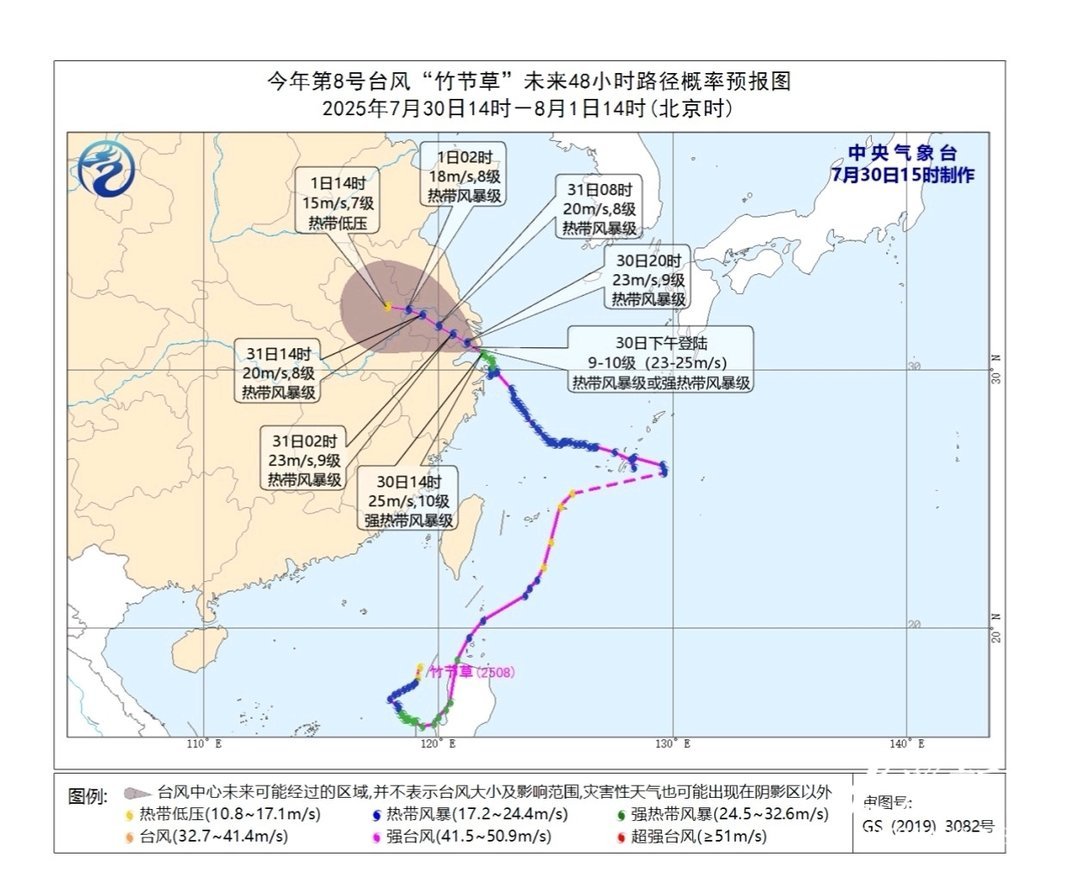 山东省气象台于7月30日16时50分发布台风蓝色预警和暴雨蓝色预警,继续发布海上大风黄色预警:今年第8号台风“竹节草”的中心已于30日16时40分前后在上海市奉贤区沿海再次登陆,登陆时减弱为热带风暴级,中心附近最大风力有9级(23米/秒),中心最低气压978百帕。预计未来“竹节草”将以每小时10~15公里的速度继续向西北方向移入江苏南部,强度逐渐减弱,于31日夜间移入安徽东部,之后在苏皖南部徘徊少动。受其影响,我省中东部将有明显风雨天气。