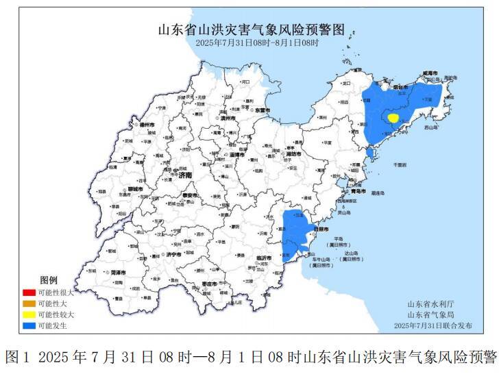 齐鲁网·闪电新闻7月31日讯 山东省水利厅和山东省气象局 7月31日联合发布山东省山洪灾害气象预警:预计7月31日08时至8月1日08时,威海市局部地区发生山洪灾害的可能性较大(黄色预警),青岛、烟台、威海、日照、临沂等市局部地区可能发生山洪灾害(蓝色预警)。