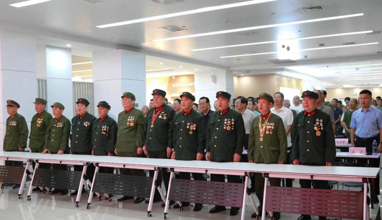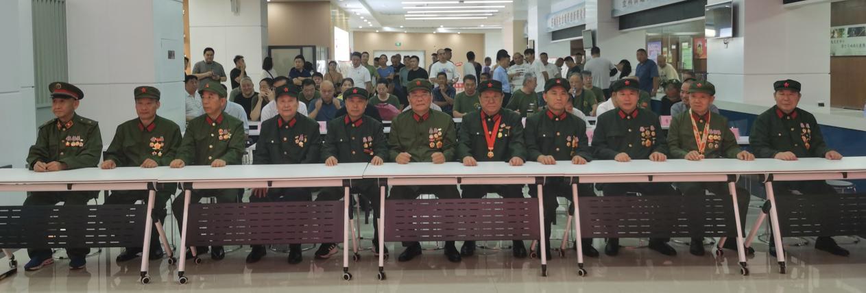 济宁市11名参加老山防御作战的老兵代表身着六五式军装、佩戴军功章被特邀在观众席第一排就坐。